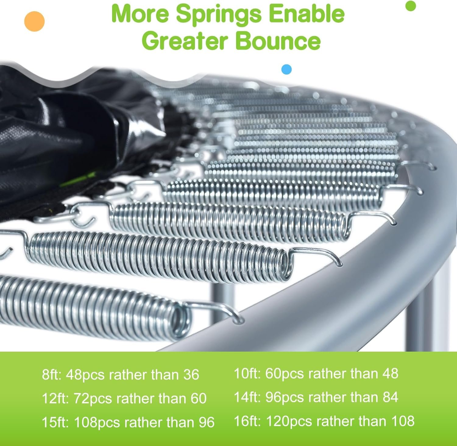 The outdoor trampoline features additional safety measures, including extra-long net poles and a thick safety pad that covers the springs. With its premium materials, the trampoline provides superior bounce and stability while keeping kids safe from injury.