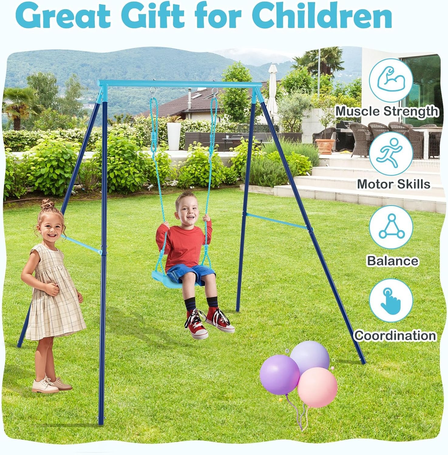 A primary convenience feature is the ease of assembly. This metal Swing set includes clear instructions and all necessary accessories for a straightforward setup. You can quickly set it up in your backyard, garden, or playground, allowing your child to start enjoying outdoor play in virtually no time. It is designed for both indoor and outdoor environments.